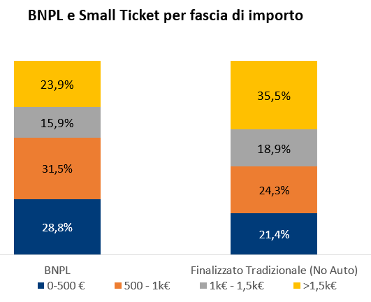 Nel mercato italiano si conferma progressivamente la dinamica di sostituzione tra il credito finalizzato tradizionale e le soluzioni BNPL relativamente alle fasce di importo più contenute. Infatti, il 60% dei contratti BNPL erogati nel 2025 mostrano ticket inferiori ai 1.000€; mentre nel 24% dei casi i finanziamenti salgono sopra la soglia dei 1.500€.