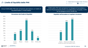 Le risposte raccolte attraverso il questionario anonimo a 437 Pmi dipingono un quadro molto articolato e fanno emergere con chiarezza come diversi fattori esogeni si siano innestati su una situazione di non perfetta pianificazione finanziaria. Più della metà del campione intervistato ha urgenza di accedere a fonti di finanziamento entro una settimana; delle categorie di aziende intervistate, quelle attive nei servizi ne hanno bisogno più di altri settori, perché tendenzialmente hanno una bassa liquidità; al contrario le imprese attive in trasporto e magazzinaggio hanno una maggiore liquidità e dunque meno urgenza. Per soddisfare il bisogno di liquidità, le PMI italiane usano prevalentemente le soluzioni tradizionali di finanziamento, soprattutto perché le soluzioni alternative, come quelle di SCF (Supply Chain Finance), sono per loro quasi sconosciute. Il punto dirimente, comunque sull’accesso al credito, sono i tassi di interesse: se sono alti diventano una barriera d’accesso insormontabile. Altri fattori chiave per un accesso al credito più fluido sono processi più rapidi di approvazione e un supporto consulenziale su misura.