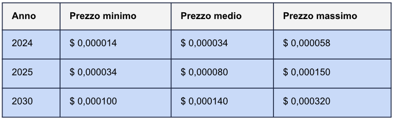 A condizione che riesca ad aumentare l’adozione dell’ecosistema, la nostra previsione dei prezzi Shiba Inu prevede un prezzo massimo di $ 0,000320, un prezzo minimo di $ 0,000100 e un prezzo medio di $ 0,000140 entro la fine del 2030.